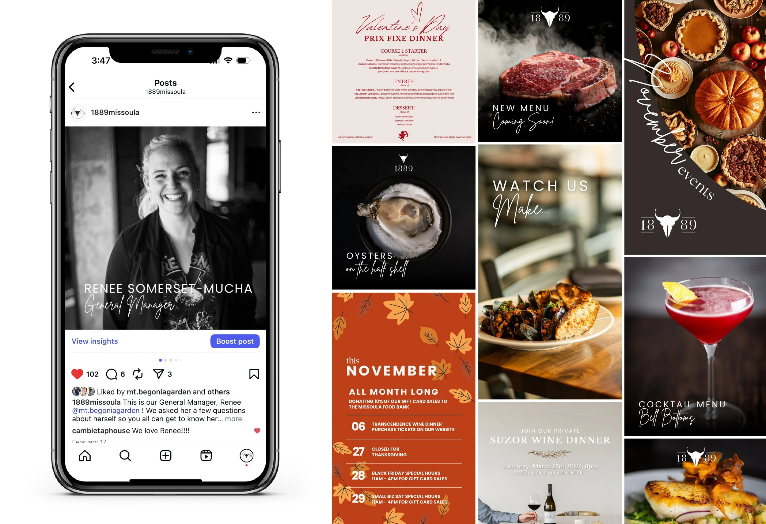 Daily management of the 1889 Social Media accounts includes not only sharing the beautiful food photography, but sharing upcoming events, closures, special hours, holidays and even showing how some of the meals are made. Management includes responding to comments, questions and messages, as well as sharing the occasional dinner or drink special.