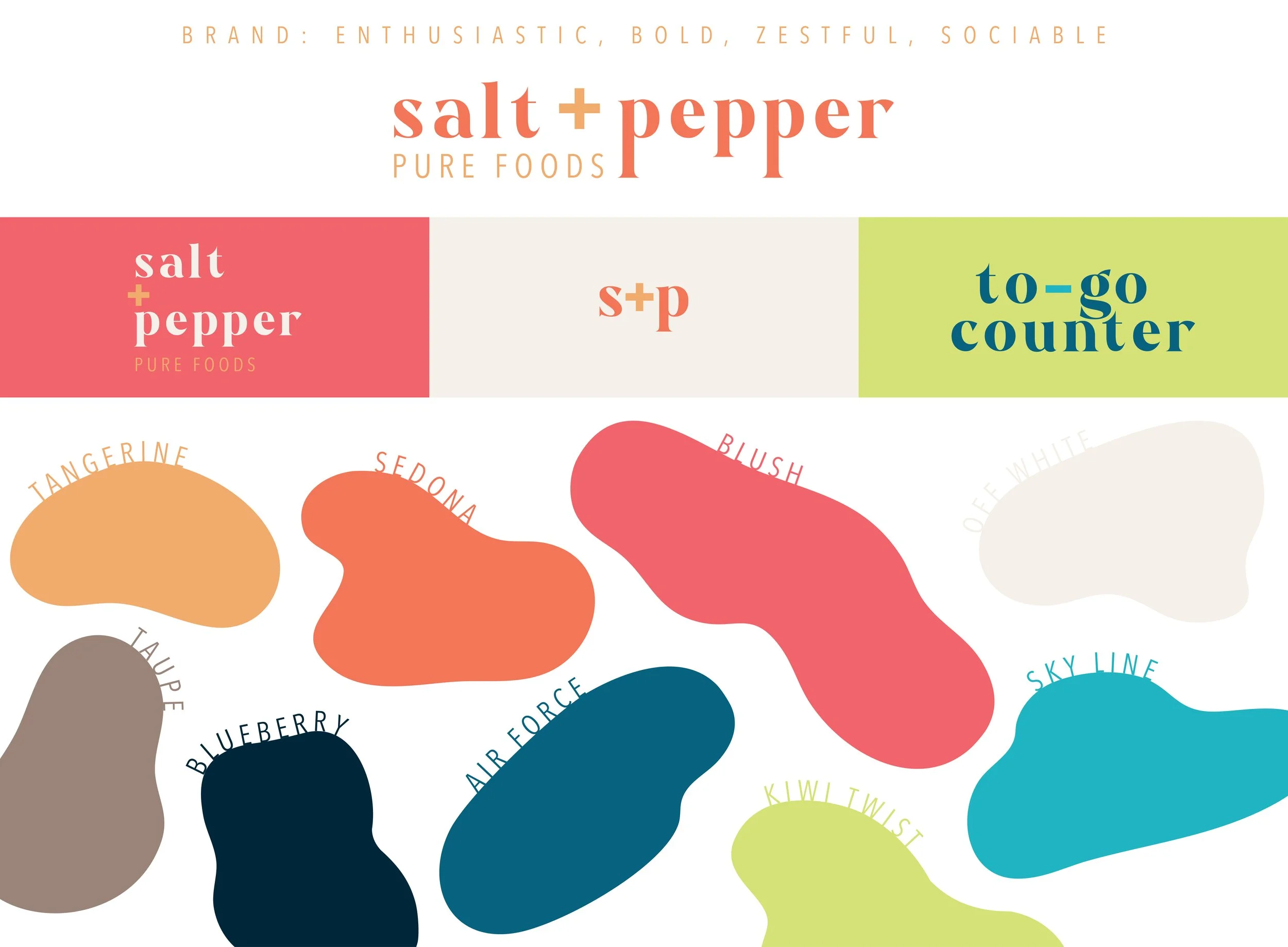 The Salt + Pepper brand is young, bold, outgoing and most importantly a brand for those looking to make healthy food choices. The bright brand colors reflect the personality and also pair well with the serif font choice. Organic shapes and beautiful food imagery reinforce the fun yet healthy voice the brand has.