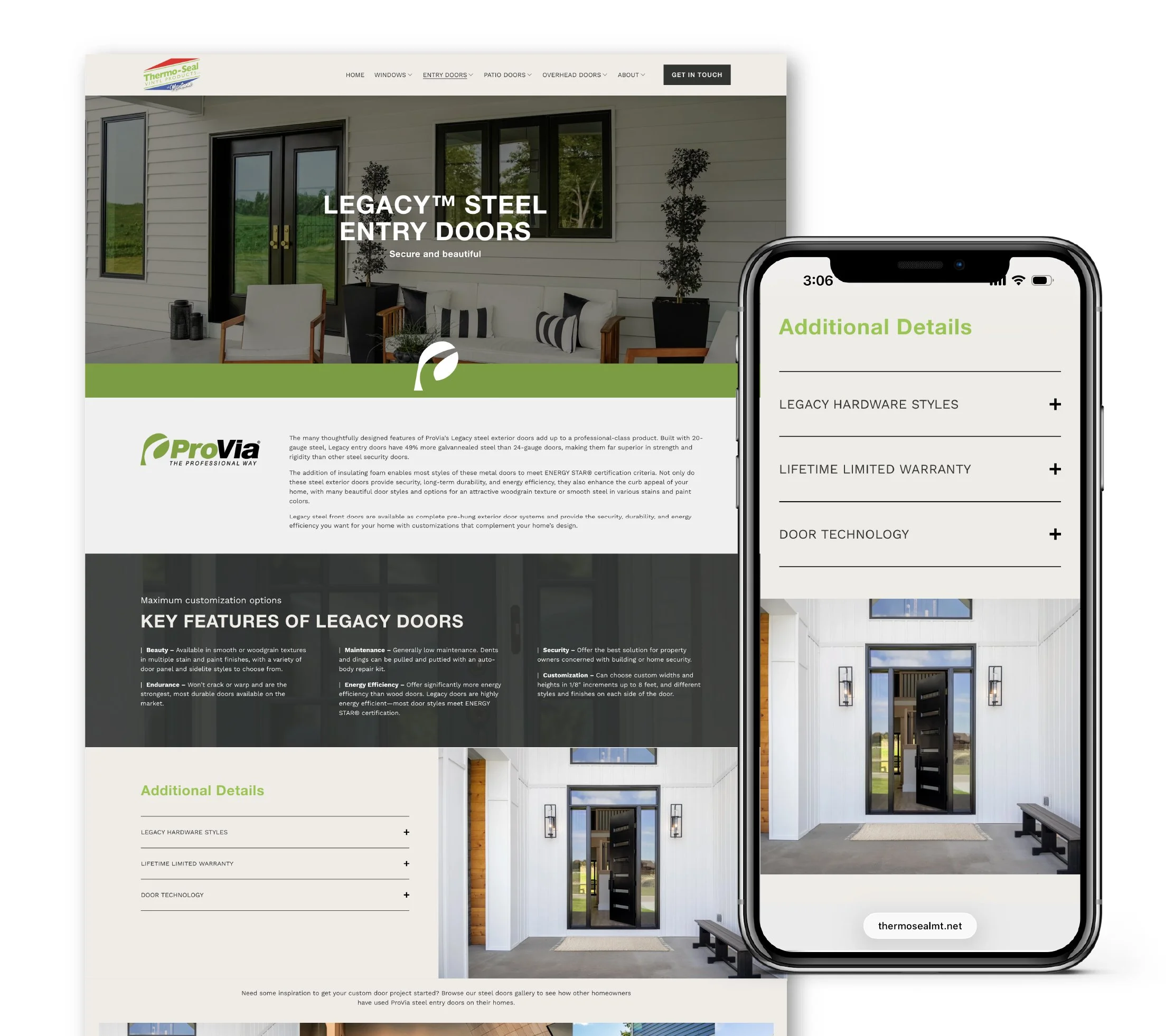 Designing a comprehensive website to house all the details of each individual door, window and overhead door was the challenge of this website design. Creating a standard so each page has the same base, then is just updated with the specific details was the key to success. Utilizing beautiful imagery with modern fonts and the pop of lime green creates a seamless website design which was then brought into different marketing projects.